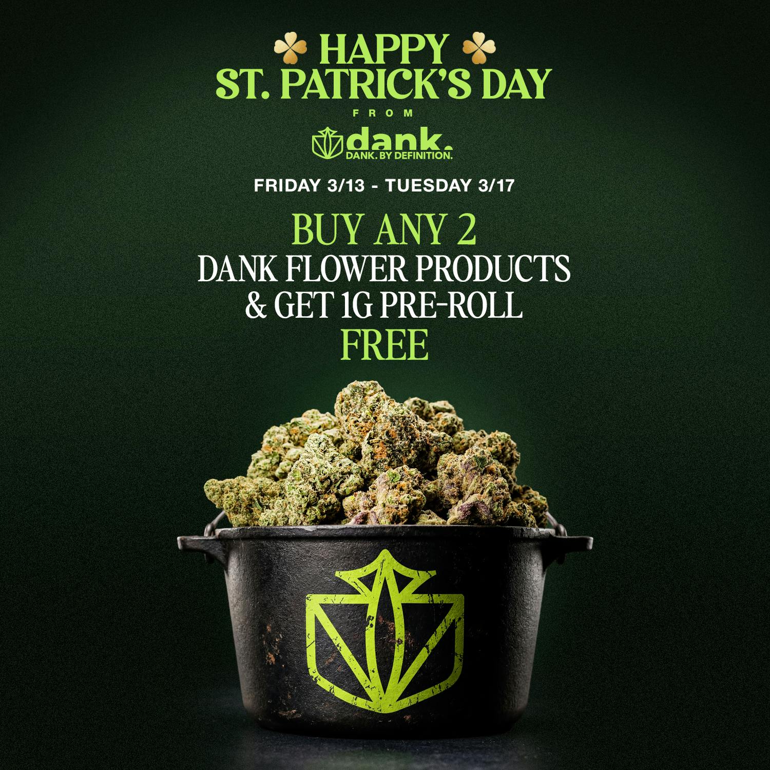 Stock up on premium Dank Flower and enjoy a little extra on us. When you purchase any two Dank flower eighths, you’ll receive a complimentary 1g pre-roll to spark up right away. Perfect for trying something new while keeping your stash full.While supplies last. Selection may vary.